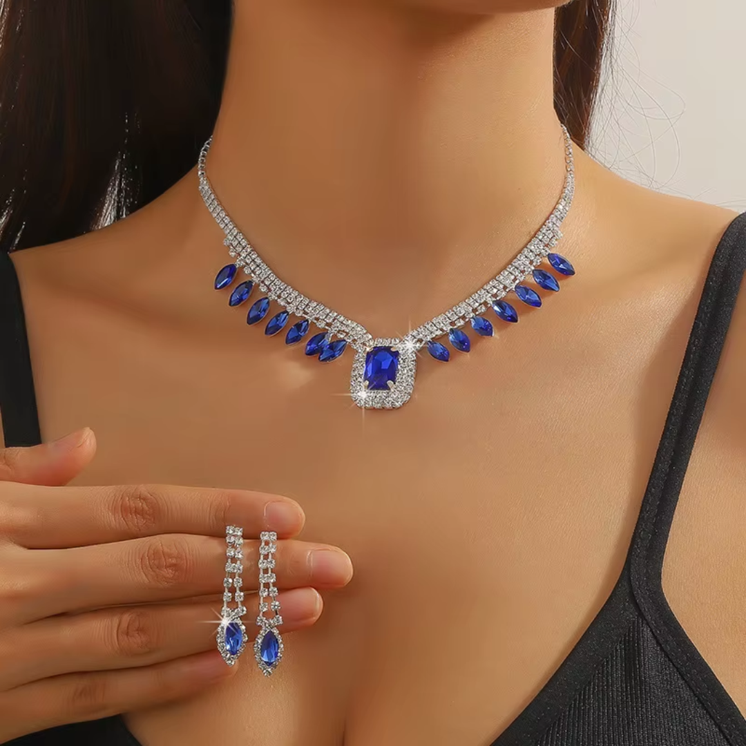 Transforme qualquer look com este maravilhoso conjunto de colar, pulseira e brincos cravejados com strass. Perfeito para noivas, madrinhas, formandas ou eventos especiais à noite, este conjunto traz sofisticação e brilho na medida certa.